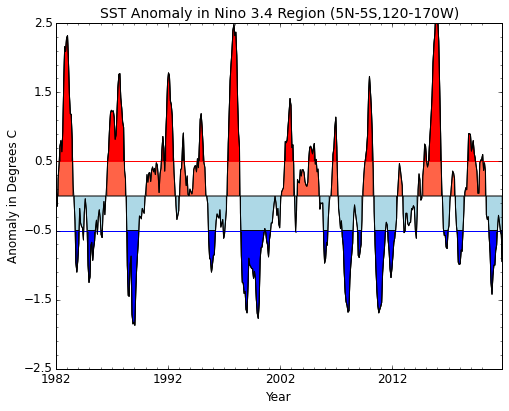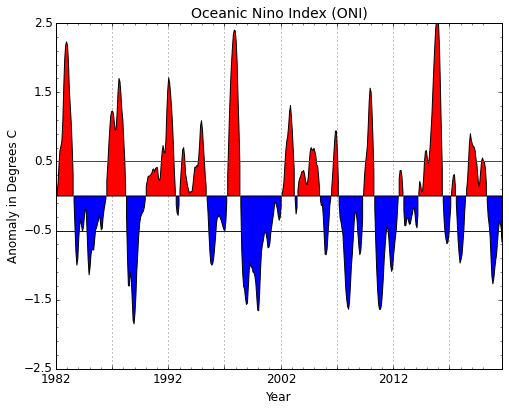 The Climate Prediction Center defines El Niño conditions as existing when a one-month positive sea surface temperature anomaly of 0.5C or greater is observed in the Niño-3.4 region of the equatorial Pacific Ocean, an expectation that the 3-month Oceanic Niño Index (ONI) threshold will be met (see graphs below), and an atmospheric response typically associated with El Niño is observed over the equatorial Pacific Ocean. Please visit the Climate Prediction Center website for El Niño status and predictions.