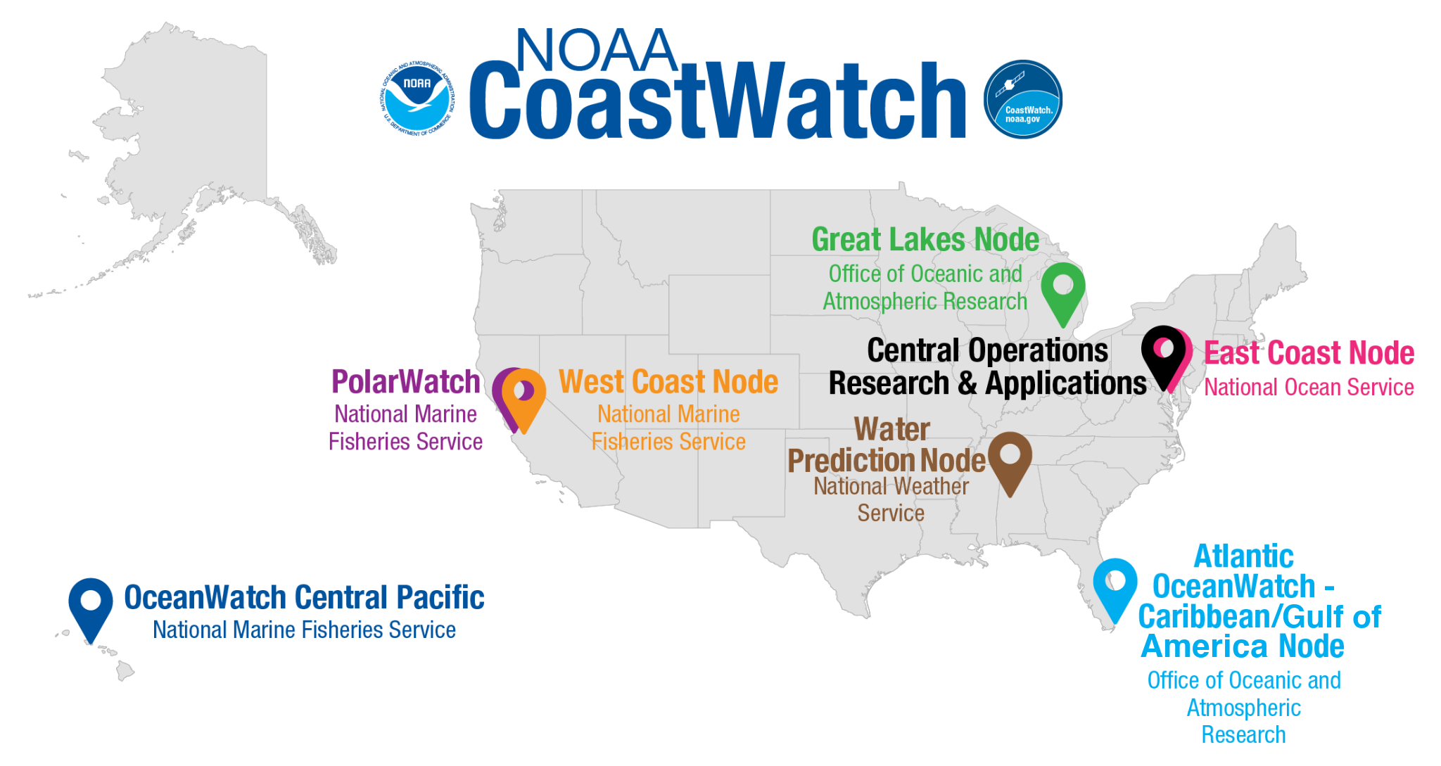 CoastWatch provides a wide range of satellite environmental data to support the work of coastal scientists and resource managers in all U.S. coastal waters. NOAA CoastWatch is organized into a Central Operations office and six Regional Nodes: