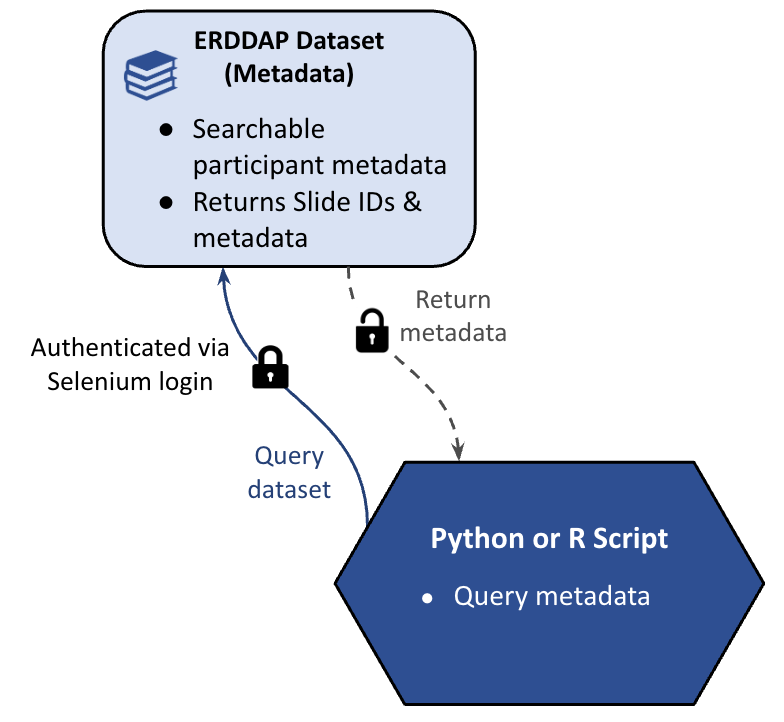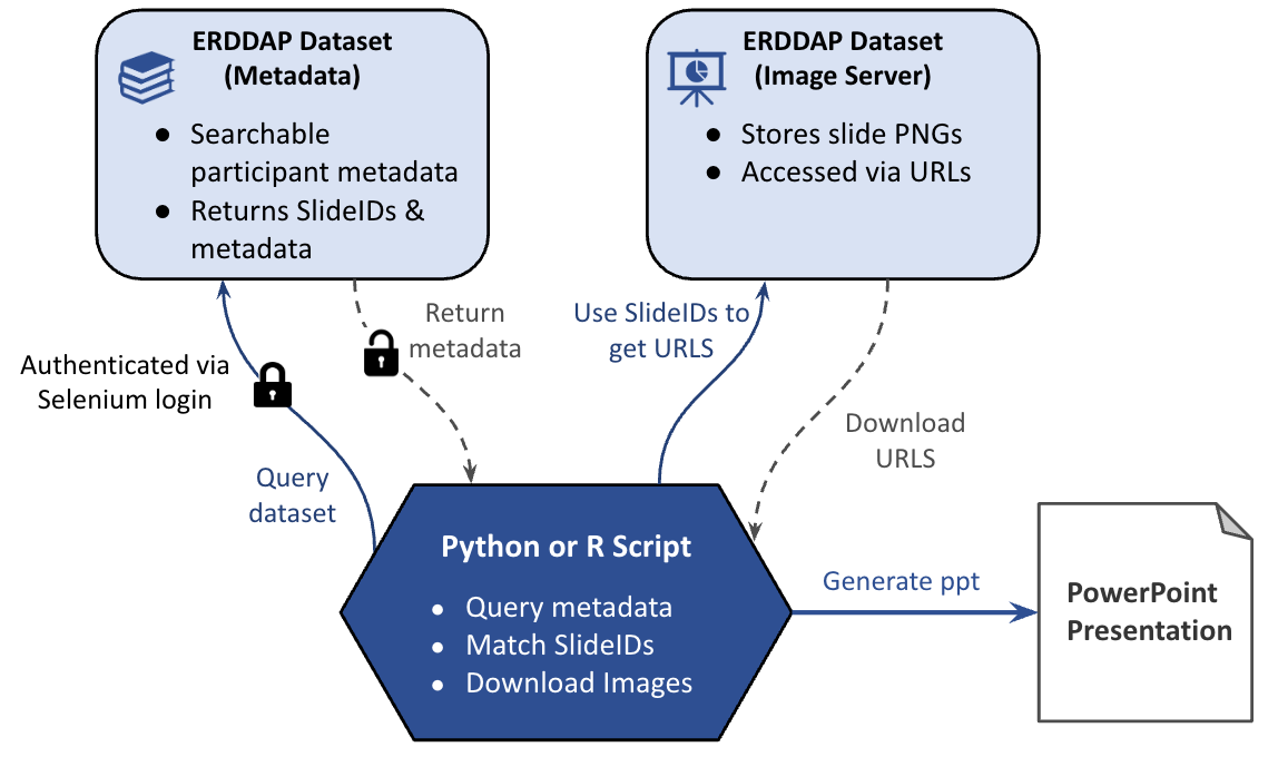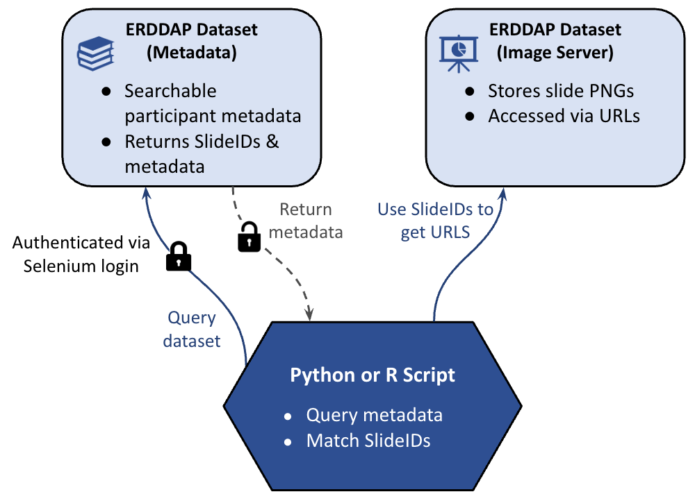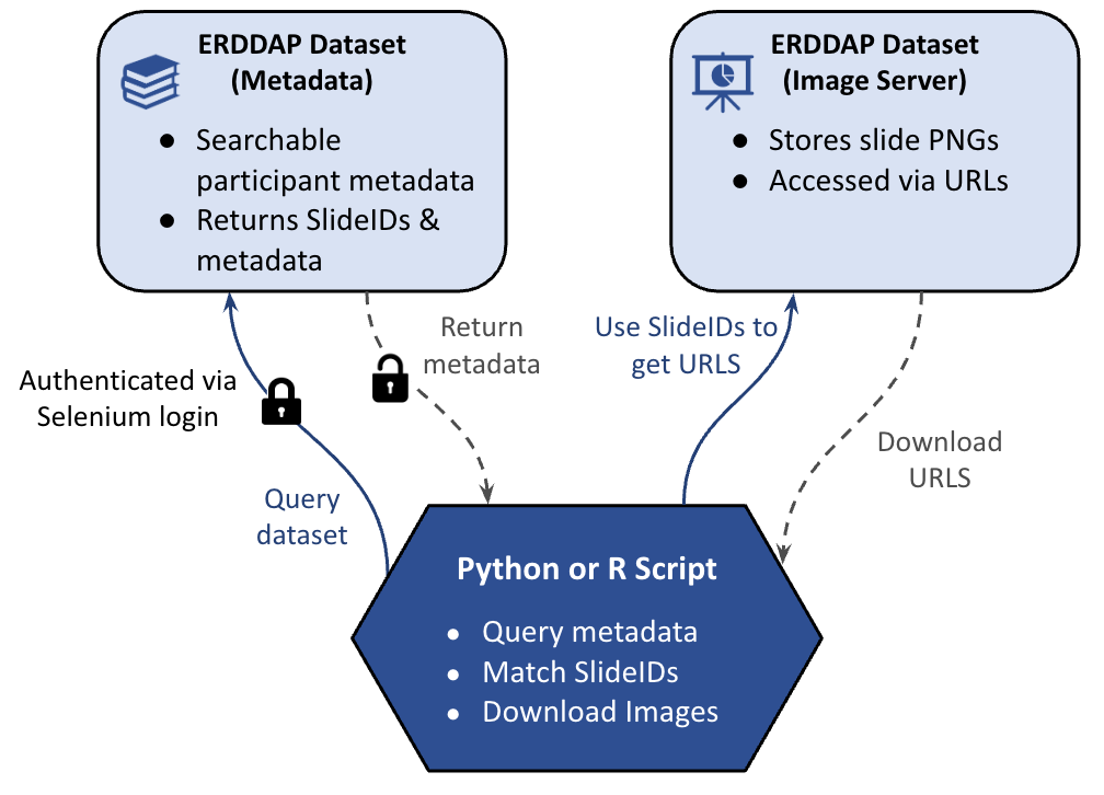 After retrieving the metadata table, the script uses the returned Slide IDs to determine which slide images correspond to the selected participants. Each Slide ID acts as a key that links the metadata dataset to the slide image dataset hosted in ERDDAP.