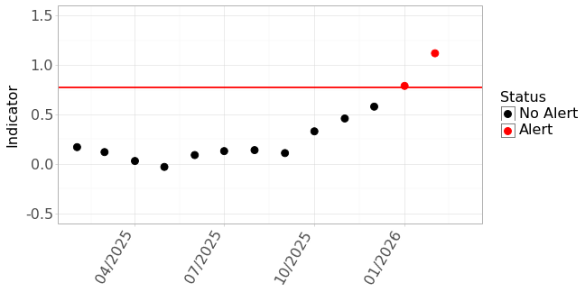 This year’s Temperature Observations To Avoid Loggerhead (TOTAL) values for the Loggerhead Conservation Area. An alert is indicated when indicator values (the timeseries) exceed a threshold of 0.77 (red horizontal line).
